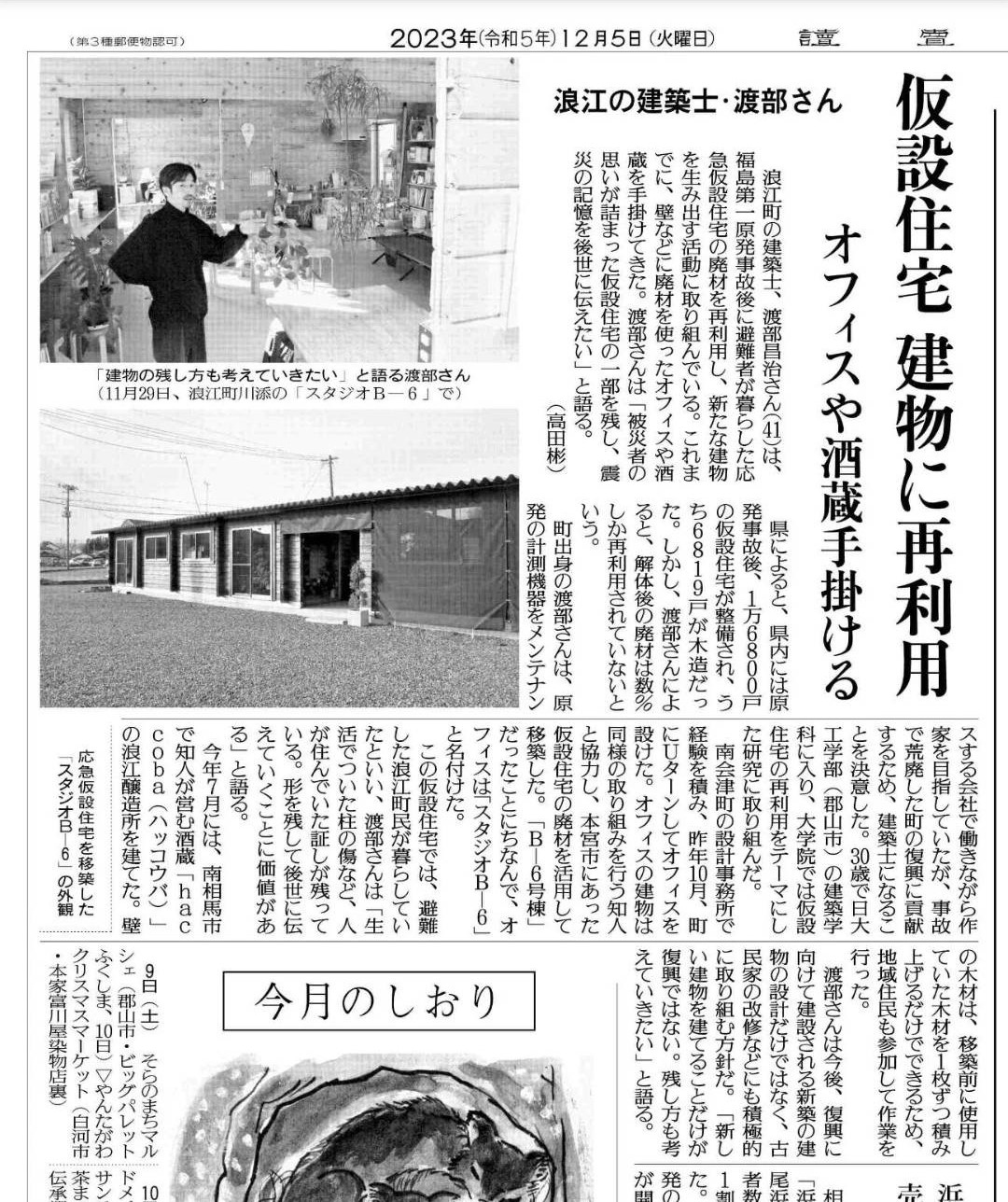 読売新聞にFimstudioとしての活動である木造仮設住宅を再利用したSTUDIO B-6、haccoba 浪江醸造所などを掲載していただきました。